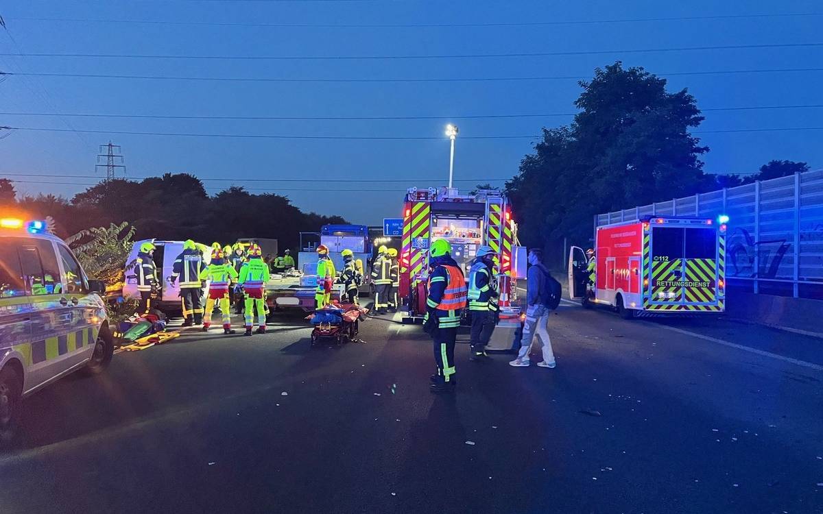 Laut Autobahnpolizei hat es in Höhe der Anschlussstelle Oberhausen-Holten gekracht. Nach bisherigen Ermittlungen wollte ein LKW einem Stauende ausweichen und hat dabei einen Kleintransporter in die Mitteleitplanke gedrückt. Laut Feuerwehr waren noch zwei weitere LKW in die Unfallstelle gekracht. Vier Menschen wurden verletzt, davon einer schwer. Ein angeforderter Rettungshubschrauber konnte aufgrund der schlechten Wetterverhältnisse nicht starten, sagt die Feuerwehr.