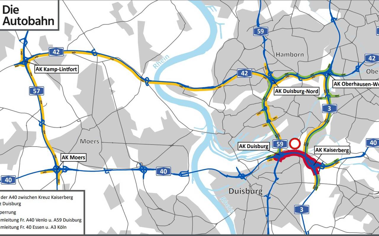 Auf der A40 müssen wir an diesem Wochenende Umwege fahren. Das hat die Autobahn GmbH angekündigt. Die A40 wird im Autobahnkreuz Kaiserberg in beiden Fahrtrichtungen vollgesperrt. Grund sind Vorarbeiten für eine neue Brücke, die im Autobahnkreuz gebaut werden soll. Gesperrt wird ab heute Abend (17.1.) 21 Uhr.