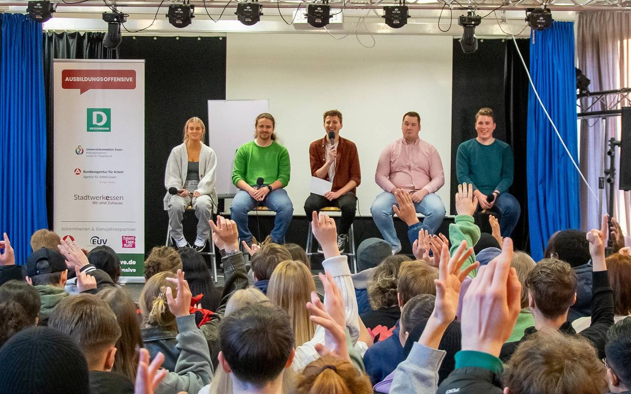 Infos von Azubis für Schüler. Das ist das Ziel der Ausbildungsoffensive. In der Gesamtschule Weierheide haben rund 100 Schüler der 12. Klasse ihre Fragen an Azubis verschiedener Unternehmen gestellt – Wie läuft ein Vorstellungsgespräch? Wieso ist ein Einführungstag so wichtig? Dabei waren Azubis der Agentur für Arbeit Essen, der Pflegeschule des Uniklinikums Essen, von Deichmann und den Stadtwerken Essen. Die Ausbildungsoffensive spricht in einer Pressemitteilung von einem großen Interesse der Schüler.