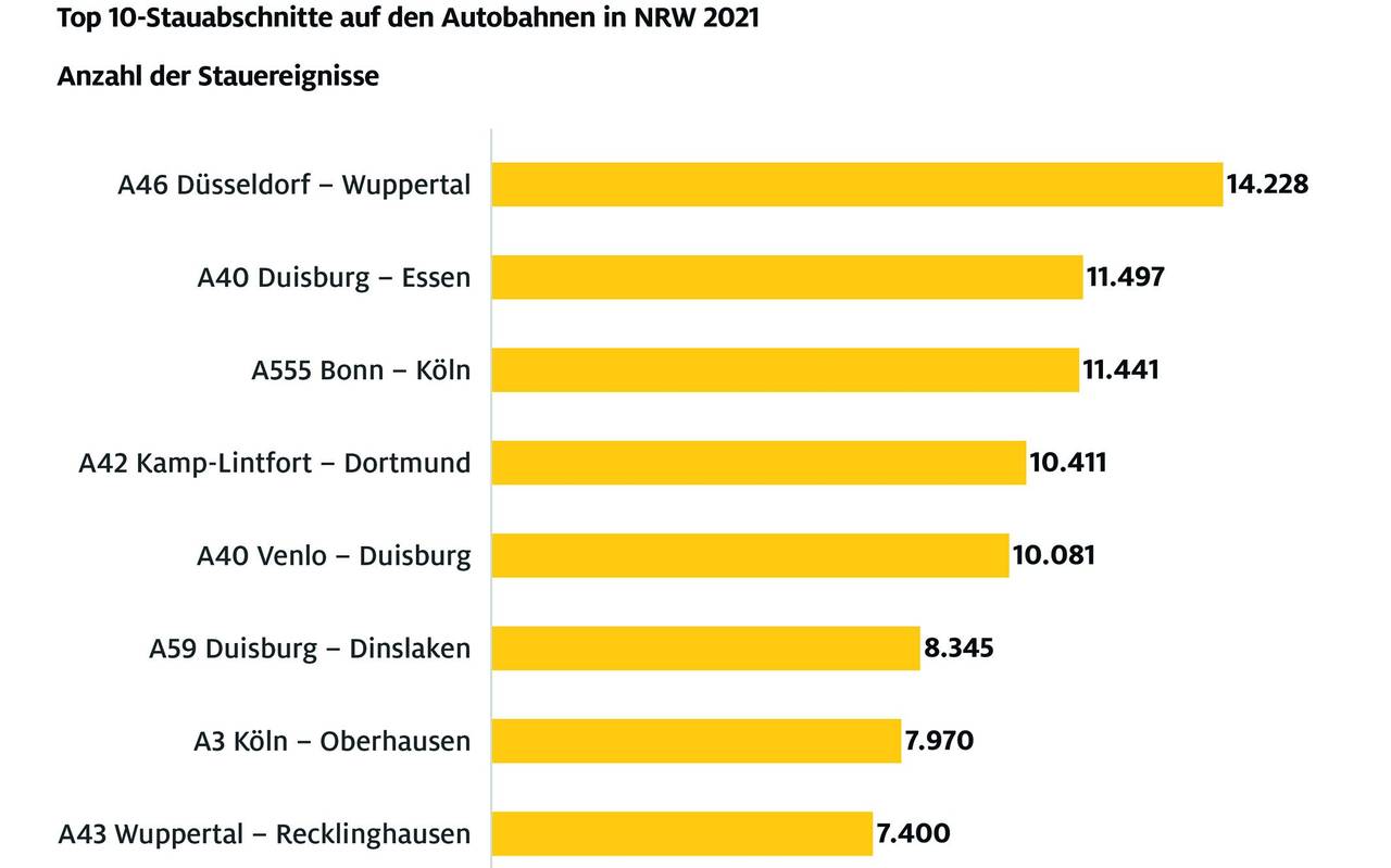 Besonders ausgeprägte Stauspitzen hat der ADAC im letzten Jahr auf der A3 zwischen Duisburg-Wedau und Oberhausen-Lirich ausgemacht, genauso zwischen Kreuz Oberhausen und Oberhausen-Holten. Ausreißer gab es zum Beispiel auch auf der A40 in Duisburg und Essen sowie auf der A42 in Herne.