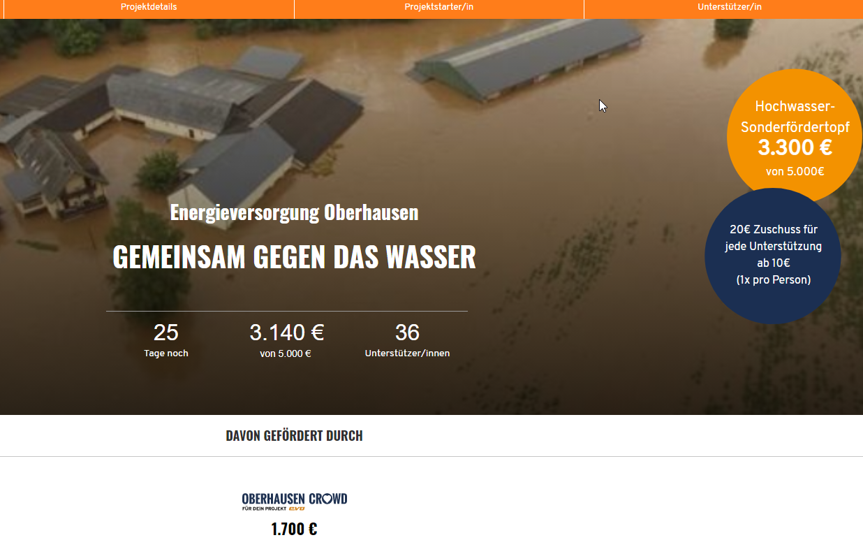 "Gemeinsam gegen das Wasser" - So heißt die Spendenaktionen auf der evo-Plattform "Oberhausen Crowd". Die Energieversorgung Oberhausen hat damit auf ihrer eigenen Seite ein Crowdfunding für die Opfer des Hochwassers ins Leben gerufen. Seit letzter Woche sind schon mehr als 3.100 Euro zusammengekommen.