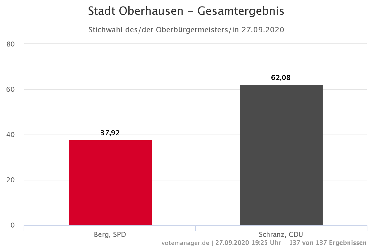 19.25 Uhr: Jetzt ist es auch offiziell. Daniel Schranz von der CDU ist alter und neuer Oberbürgermeister in Oberhausen. Bei der Stichwahl gegen Thorsten Berg (SPD) holte Schranz rund 62 Prozent der Stimmen.
