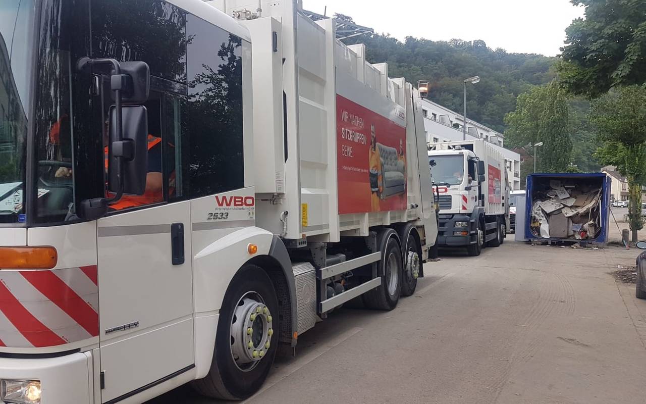 Seit letzter Woche sind drei große Sperrmüllwagen, ein Pritschenwagen und 14 Mitarbeiterinnen und Mitarbeiter in der Nachbarstadt im Einsatz. Sie helfen dabei, Sperrmüll und Elektroschrott von den Straßen zu entfernen. Außerdem war ein zweiköpfiges WBO-Team im Katastrophengebiet in Bad Neuenahr im Einsatz. Sie halfen mit einem Saug-Spülwagen, von Schlamm verstopfte Kanäle zu reinigen. Die Mitarbeiter sind mittlerweile wieder zurück in Oberhausen und könnten jederzeit wieder unterstützen, heißt es von den Wirtschaftsbetrieben.