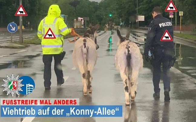Die Polizei Oberhausen war heute Morgen mit zwei ausgebüxten Eseln auf der Konrad-Adenauer-Allee unterwegs. Die Beamten haben die Tiere an der Leine über die gesperrte Fahrbahn geführt und zurück zum Kaisergarten gebracht.