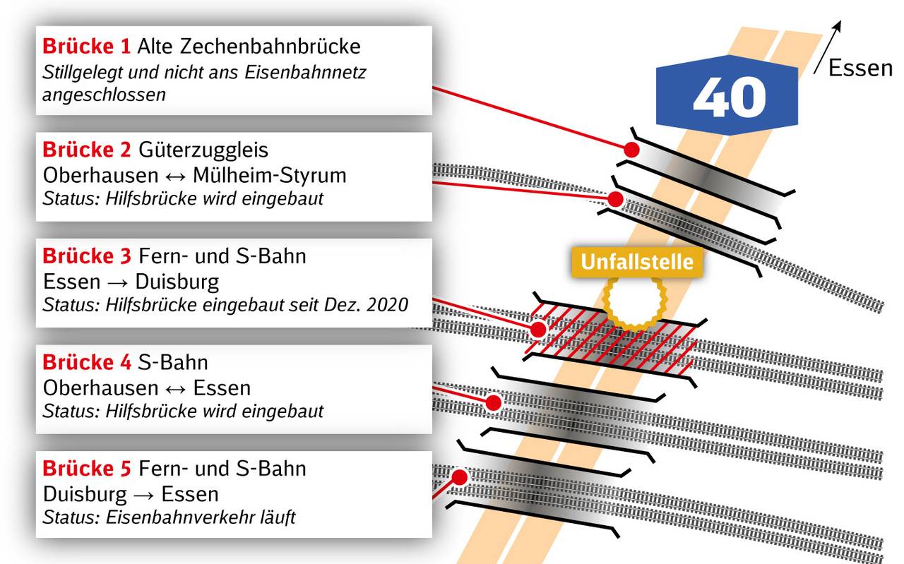 Nach dem verheerenden LKW-Unfall unter den Bahnbrücken der A40 bei Styrum stehen die nächsten Arbeiten an. Zwei weitere Behelfsbrücken müssen in den nächsten Monaten eingesetzt werden. Dafür werden die Bahnstrecke zwischen Essen und Duisburg und die A40 mehrfach gesperrt.