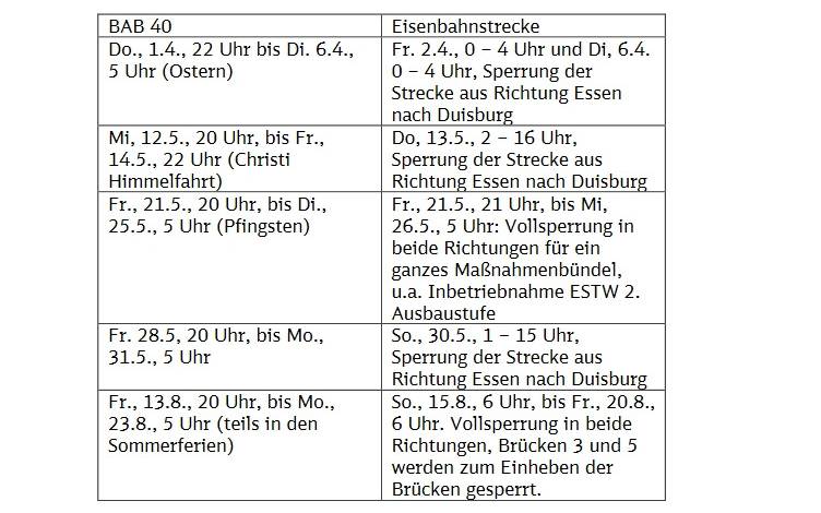 Die Autobahn wird zum ersten Mal am Osterwochenende in Höhe Styrum dicht gemacht. Außerdem gleich drei Mal im Mai und ein letztes Mal im August. Anfang September soll dann alles fertig sein. Dann können Regional- und Fernverkehr, S-Bahnen und Güterzüge wieder wie vor dem Unfall rollen. Erst Ende des Jahrzehnts werden die Behelfsbrücken wieder entfernt und durch komplett neue Bauwerke ersetzt.