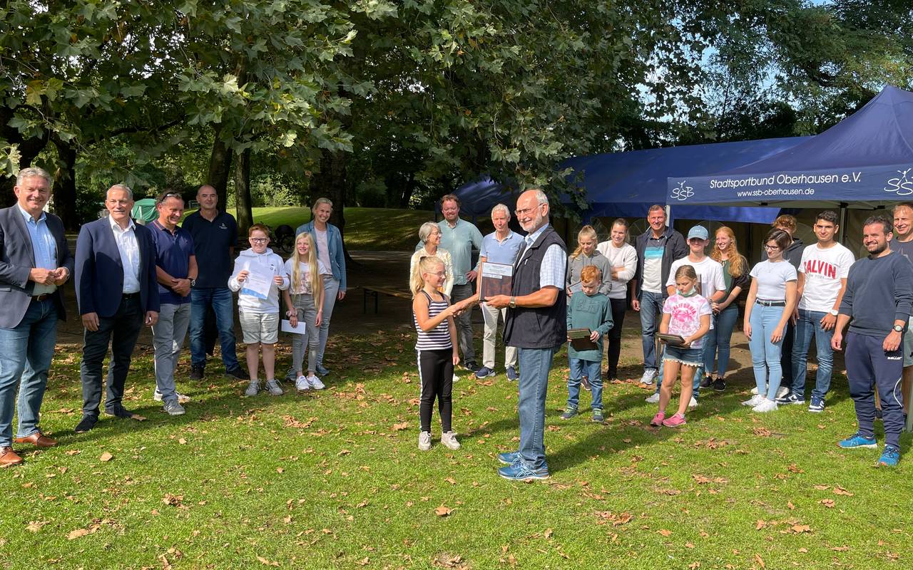 In Oberhausen haben 1784 Schülerinnen und Schüler jetzt ihr Sportabzeichen bekommen. Das hat die Stadt mitgeteilt. Im vergangenen Jahr war die Ehrung wegen Corona ausgefallen, deshalb hat der Stadtsportbund die Abzeichen für 2019 und 2020 jetzt auf einer gemeinsamen Veranstaltung vergeben.