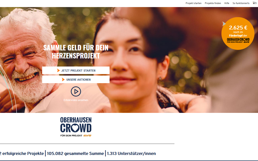 Auf der Internetplattform www.oberhausen-crowd.de gibt es Projekte unterschiedlichster Art, das kann von Anschaffungen für öffentliche Plätze bis hin zur Unterstützung gemeinnütziger Organisationen gehen. Aktuell zum Beispiel wird Geld gesammelt für einen schwerstbehinderten Jungen, den Traditions-Zirkus Paul Busch und eine neue Skulptur für die Ludwiggalerie vor dem Schloß Oberhausen.
