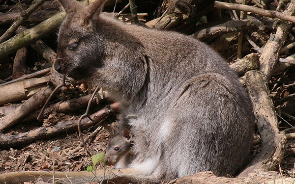 Für das Zoo-Team waren die kleinen Hüpfer für lange Zeit unsichtbar. Dass in den Beuteln der Mütter tatsächlich junge Kängurus heranwachsen, wissen die betreuenden Tierpfleger mit Sicherheit erst seit einigen Wochen. Der Grund: „Bei der Geburt sind junge Beuteltiere gerade einmal so groß wie ein Gummibärchen, nackt und vollkommen blind. Sie krabbeln selbstständig in den Beutel der Mutter und wachsen hier für viele Monate und auch für uns unsichtbar heran“, erklärt der Revierleiter. Erst nach einigen Lebensmonaten lassen erst Bewegungen im Beutel auf das Mutterglück schließen.