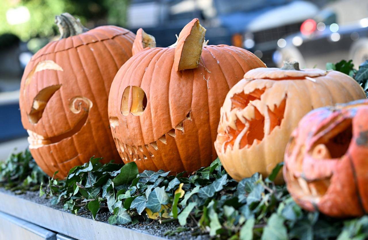 Ausgehöhlte Kürbisse mit gruseligen Fratzen in einem Vorgarten in Frankfurt am Main. (Archivbild)© Arne Dedert/dpa