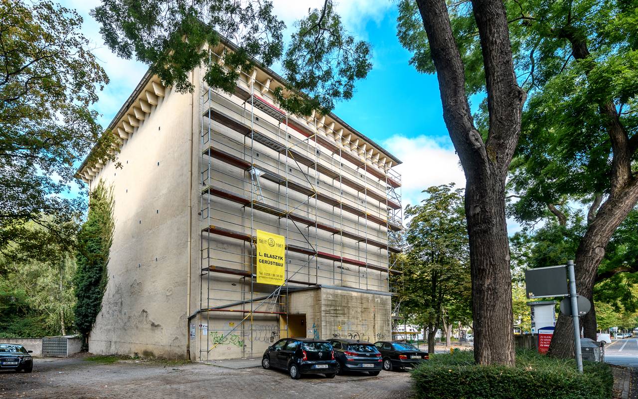 Der Hochbunker an der Ebertstraße in der Innenstadt wird bald zum Hingucker. Die bisher eintönige Fassade des Gebäudes wird zu einem Gemälde. Die Seite zur Sedanstraße hin wird komplett bemalt, die zum Ebertplatz hin teilweise. Das hat die Initiative "Eine-Welt-Netz" angekündigt.