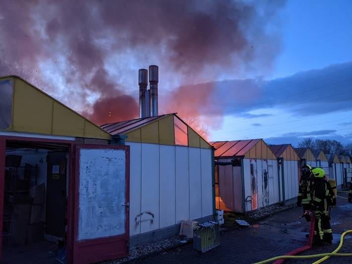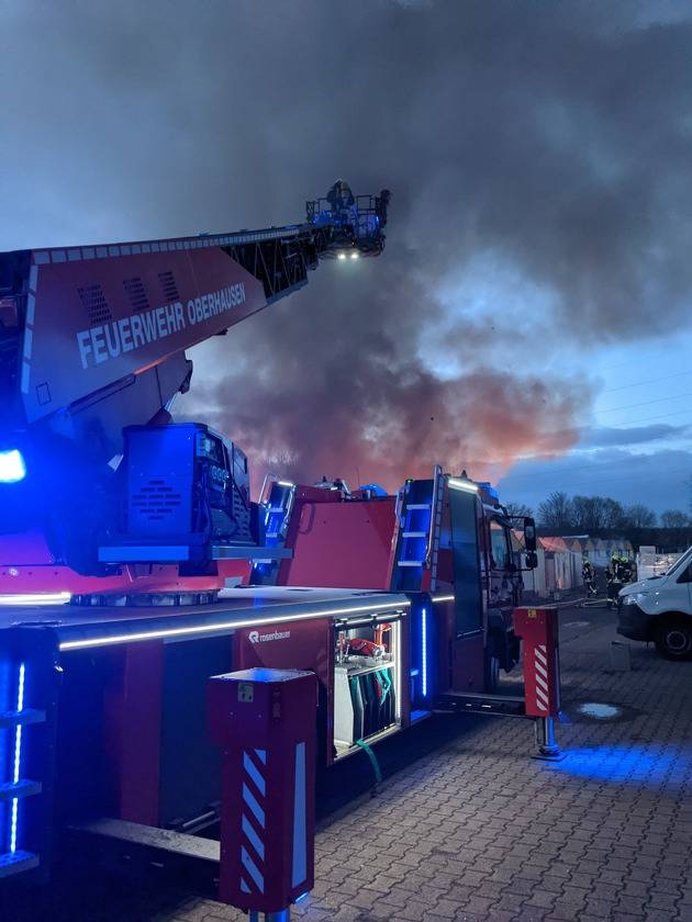 Die Einsatzkräfte konnten schon bei der Anfahrt die große Rauchsäule sehen. Als sie eintrafen, schlugen Flammen aus dem Dach einer 20 mal 50 Meter großen Halle. Wir haben von drei Seiten gelöscht, sagt die Feuerwehr. So konnte der Brand nicht auf die Hallen daneben übergreifen. Die Berufsfeuerwehr Oberhausen und die Freiwillige Feuerwehr Königshardt waren rund drei Stunden im Einsatz. Die Freiwillige Feuerwehr Sterkrade stellte während der Löscharbeiten den Schutz für das Sterkrader Stadtgebiet sicher. Verletzt wurde bei dem Feuer niemand. Die Polizei ermittelt wegen der Brandursache.