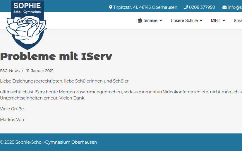 Die digitale Lernplattform IServ ist heute Morgen zusammengebrochen. Eigentlich arbeiten viele Oberhausener Schulen wie zum Beispiel das Sophie-Scholl- und das Freiherr-vom-Stein-Gymnasium, die Friedrich-Ebert-, die Theodor-Heuss- und die Anne-Frank-Realschule sowie die Fasia-Jansen-Gesamtschule damit. Jetzt geht aber zum Start in den Distanzunterricht erst mal gar nichts mehr.