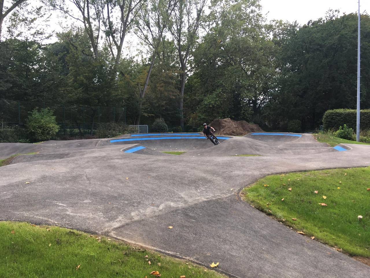 Da, wo früher Inline-Hockey gespielt wurde, ist jetzt eine "Pumptrack-Anlage". Das ist eine künstlich angelegte Strecke mit Hügeln und Kurven für spezielle Fahrräder und Mountainbikes. Die Stadt hat 720.000 Euro in die neue Trendsportanlage gesteckt.