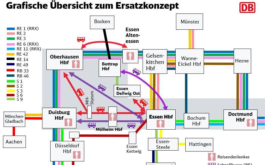 Die betroffenen Eisenbahnverkehrsunternehmen (EVU) DB Regio NRW, Abellio Rail NRW GmbH, NordWestBahn und National Express setzen in Abstimmung mit der DB Netz und dem Verkehrsverbund Rhein-Ruhr (VRR) weitestgehend die aus den vergangenen Sperrungen bewährten Ersatzkonzepte um, um die Auswirkungen auf die Bahnkunden so gering wie möglich zu halten.