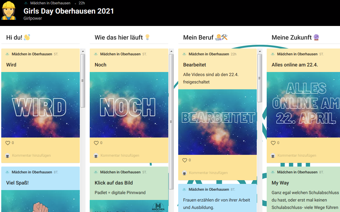 Zum Beispiel hat das Fachgremium "Mädchen in Oberhausen" zum Girls Day eine Online-Pinnwand gebastelt. Dort erzählen Frauen in Interviews über ihre Berufe, es gibt Tipps und Tricks rund um die Berufswahl für die Mädchen. Sie können Videos und Informationen anklicken, ein Quiz mitmachen und weiterführende Links nutzen. Gedacht ist die Pinnwand für alle Mädchen ab der 7. Klasse. Sie können sich allein durchklicken oder das begleitet durch ihre Schule tun, heißt es. Hier geht es auf die Girls Day-Pinnwand.