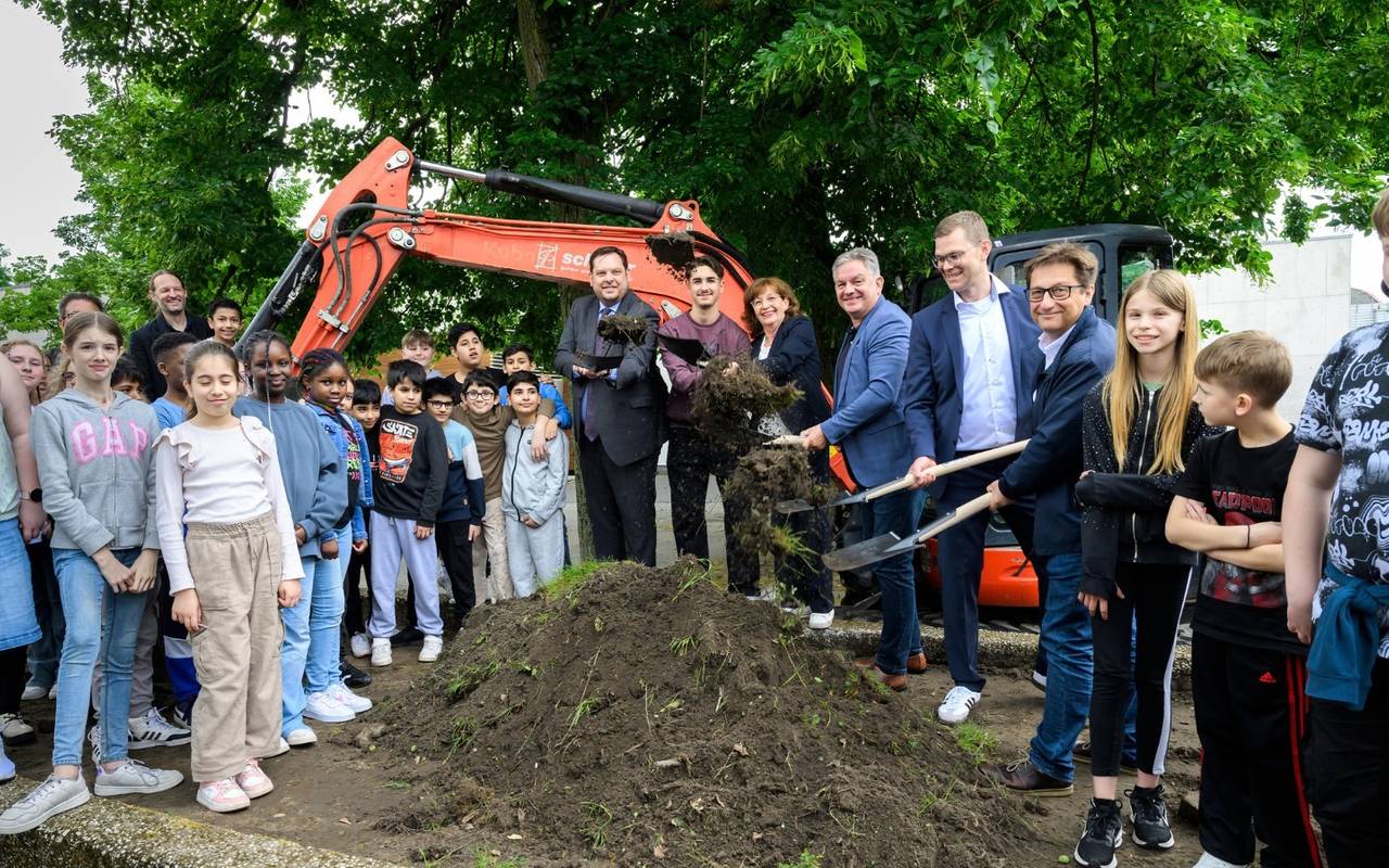 An der Anne-Frank-Realschule sollen Schüler bald auch im Freien unterrichtet werden können. An der Schule in Alt-Oberhausen gab es jetzt den offiziellen ersten Spatenstich zur Umgestaltung des Geländes.