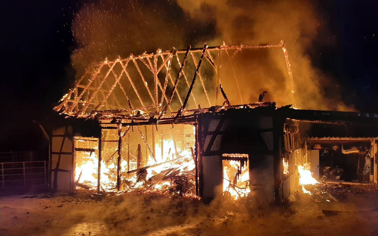 Heute (11.9.) am frühen Morgen ist in Essen-Kettwig eine Scheune in Flammen aufgegangen. Als die Feuerwehr eintraf, drohten die Flammen schon auf das Haupthaus überzuspringen. Die Scheune stand auf einer Fläche von rund hundert Quadratmetern in Vollbrand.