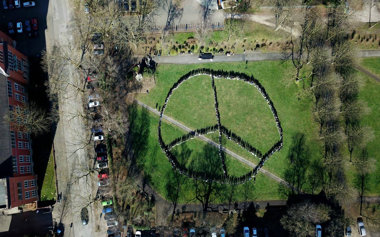 Sie wollten "dem schwer zu fassenden Gefühl von Unsicherheit, Trauer, Fassungslosigkeit, aber auch Mut und Hoffnung auf eine bessere Welt" Ausdruck verleihen. Im Park wurde eine mobile Bühne für Reden aufgebaut. Im Anschluss positionierten sie sich auf vorher angebrachten Markierungen auf der Wiese, um ein großes Peace-Zeichen zu formen, das auch weit aus der Luft noch zu sehen war. Bis zu 500 Schülerinnen und Schüler sollen daran teilgenommen haben. Diese Veranstaltung war im Vorfeld bei der Polizei angemeldet worden.