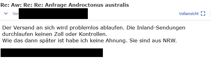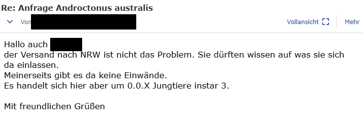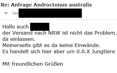 „Der Versand nach NRW ist nicht das Problem. Sie dürften wissen, auf was Sie sich da einlassen. Meinerseits gibt es da keine Einwände.“ Der Händler im Internet bietet uns einen Mengenrabatt an: 20 Euro pro Tier. Ab 10 Stück wird’s günstiger. 15 Euro kostet der Versand per DHL, mit „Styroporbox und Heatpack“. Der Händler aus dem Internet macht sich in diesem Moment mutmaßlich strafbar. Was er uns da gerade verkaufen will, ist potenziell tödlich. Androctonus australis, so heißt der Skorpion, der zu den giftigsten der Welt gehört. Angeboten im Internet in einem Terraristik-Forum.