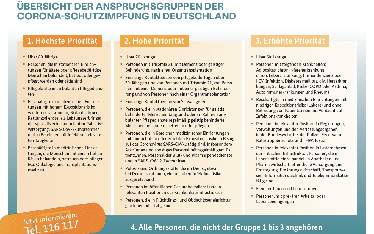 In der ersten Gruppe mit "höchster Priorität" sind zum Beispiel alle über 80-Jährigen und die Pflegekräfte der Heime. In der zweiten Gruppe mit "hoher Priorität" stehen unter anderem die über 70-Jährigen, kranke Menschen - zum Beispiel mit Demenz und bestimmte Ärzte sowie Polizei- und Ordnungskräfte. In Gruppe drei mit "erhöhter Priorität" werden unter anderem alle über 60-Jährigen und Personen in relevanten Positionen wie Verwaltung, Feuerwehr, Justiz oder Bundeswehr geimpft. Außerdem das Personal von Supermärkten, Apotheken, Müllabfuhr und Nahverkehr, genauso wie Lehrer und Erzieher. Gruppe vier umfasst dann alle Personen, die in den vorangehenden Gruppen noch nicht erwähnt wurden.