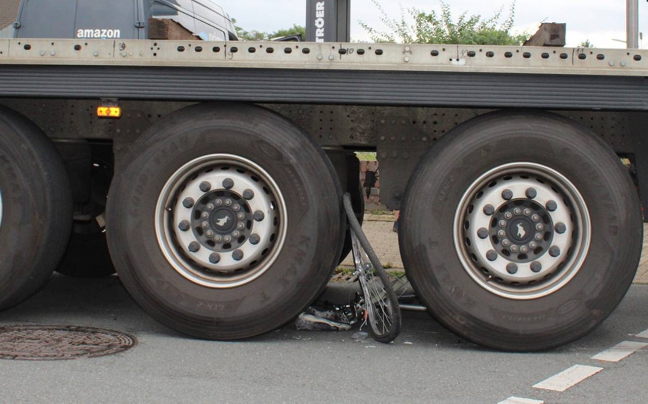 Gestern Nachmittag (9.9.) ist in Lirich ein Unfall zwischen einem LKW und einem Radfahrer erstaunlich harmlos ausgegangen. Auf einem Polizeifoto ist ein völlig zerstörtes Fahrrad zwischen riesigen LKW-Reifen zu sehen.