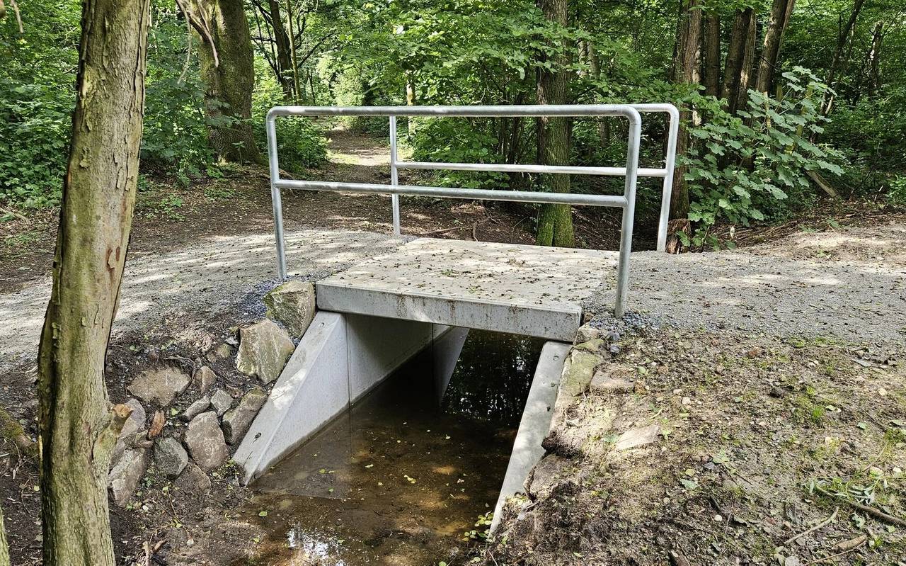 Spaziergänger kommen ab sofort wieder sicher über den Reinersbach in der Sterkrader Heide. Die WBO hat den alten, maroden Übergang durch eine neue Brücke ersetzt.