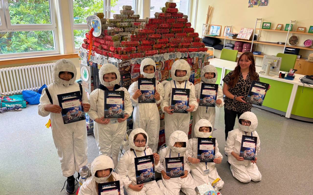Mit ihrem selbstgebauten Raumschiff haben sie den ersten Platz belegt. Zu den Teilnahmebedingungen gehörte, dass alle zehn Kinder in das Raumschiff passen müssen. Die Oberhausener OGS hat es aus alten Verpackungen gestaltet. Zusätzlich haben die Schüler noch eigene Raumfahrtanzüge gebastelt. Zur Preisverleihung gehörte im Anschluss ein vierstündiger Drohnenworkshop für die Kinder.