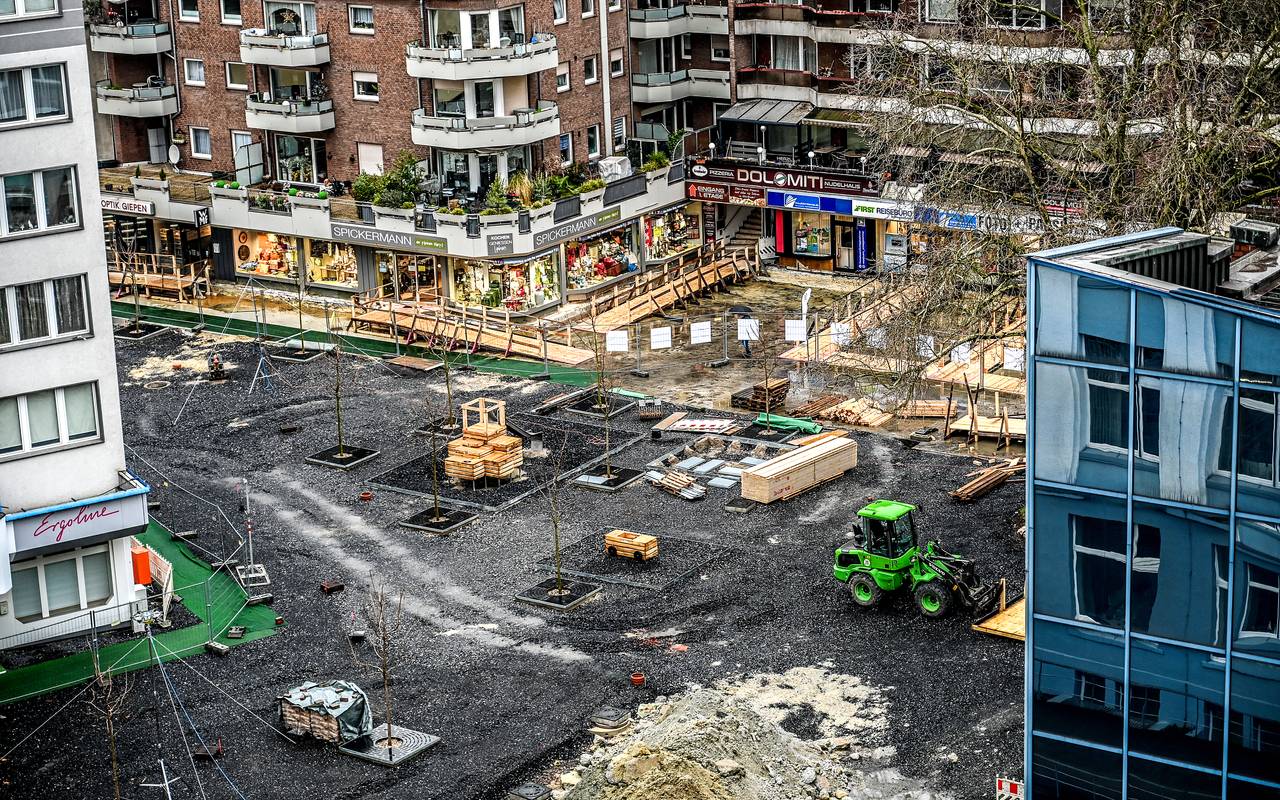 Die Bauarbeiten am Kleinen Markt in Sterkrade ziehen sich in die Länge. Grund dafür sind mögliche Probleme mit der Tiefgarage, die unter der Fläche liegt.